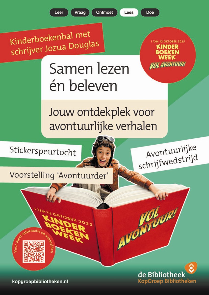 Van 1 t/m 12 oktober is het weer Kinderboekenweek. Het thema van de Kinderboekenweek dit jaar is ‘Vol avontuur!’. In een boek is avontuur immers nooit ver weg! Van woeste zeeën tot betoverende landen, een groot geheim tot een spannend mysterie, je kunt het je zo gek niet bedenken of het is wel te beleven met een kinderboek. De Kinderboekenweek van 2025 draait om het beleven van spannende verhalen vanuit je luie stoel of warme bed. Ga mee op avontuur!